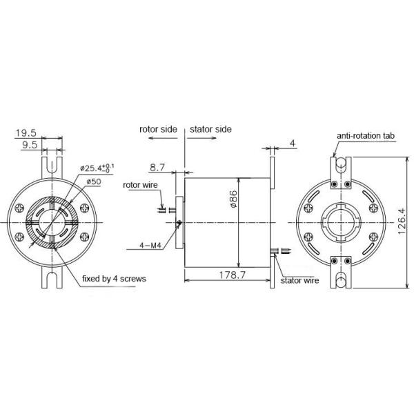 It combines the characteristics of through hole slip ring and Ethernet signal,centre hole diameter is 25.4mm convenient to install ,as well as integrate fiber optic ,RF rotary joint.On both the stator and rotor for simplified electrical connections with RJ 45 connector for directly plug.