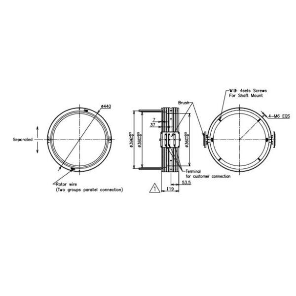 This two half style slip rings have 360mm through hole size,combine five power lines which support current with above 40Amp on each line and signal line.Carbon brush technology is applied in this design.Easy maintenance, long lifespan and simple mouting are the advantage of this type slip rings.