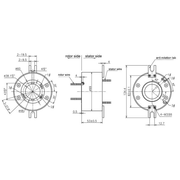 Through hole slip ring has many install ways, the flange mounting is customed by many clients. First align the mounting holes in the flange to mounting base and install flat washers and mounting screws(NOT SUPPLIED).Securely tighten screws,then route the wiring and make the necessary connections. Do not allow the wiring to restrict free rotation of the slip ring.use 5/16 (Max diameter) screw fix the Anti-rotation tab properly.